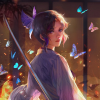 dark hair, wearing traditional samurai attire, including a sword on her hip and possibly some form of armor or clothing that is associated with samurai culture. There are butterflies flying around her, which could symbolize freedom or transformation. The background suggests