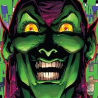 book cover featuring a character known as the Green Goblin, who is depicted with an exaggerated expression of laughter or madness. The character has green skin and white teeth, which are characteristic features of this villainous figure from