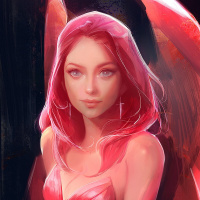 pink hair, wearing a red outfit. She appears to be sitting or standing in front of a backdrop that has a darker color on the left side, transitioning into a lighter shade on the right side. The artwork style is illustrative and detailed, possibly inspired by comic book art or character designs for
