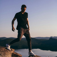 rocky outcrop, overlooking a valley or body of water. The individual appears to be gazing into the distance, perhaps taking in the view or contemplating something. The background suggests a natural landscape with mountains or hills in the distance and