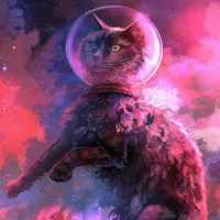 The image features an anthropomorphic cat wearing a spacesuit and standing on what appears to be a planet. The background is vibrant with shades of purple, suggesting it might represent space or another celestial body. This artwork combines elements of science fiction with the playful concept of a cat as an astronaut.