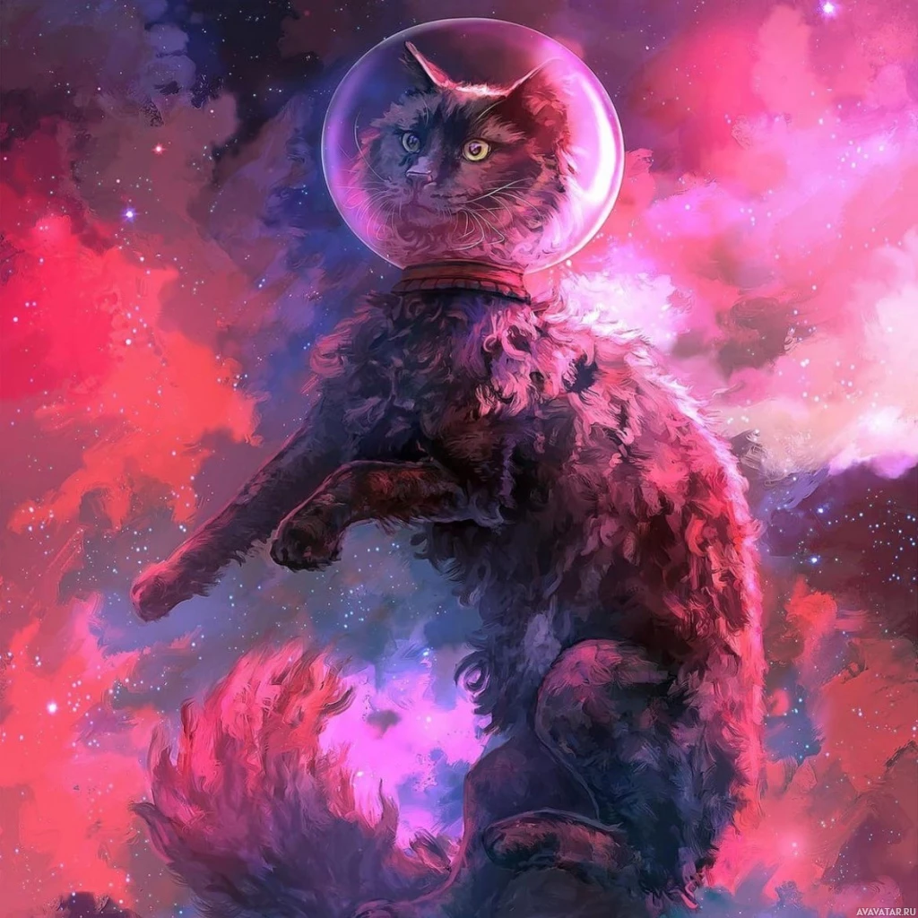 На картинке изображен антропоморфный кот в скафандре, стоящий на чем-то, похожем на планету. Фон выполнен в ярких фиолетовых тонах, что позволяет предположить, что он может представлять космос или другое небесное тело. В этой работе сочетаются элементы научной фантастики с игривой концепцией кота-астронавта.