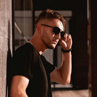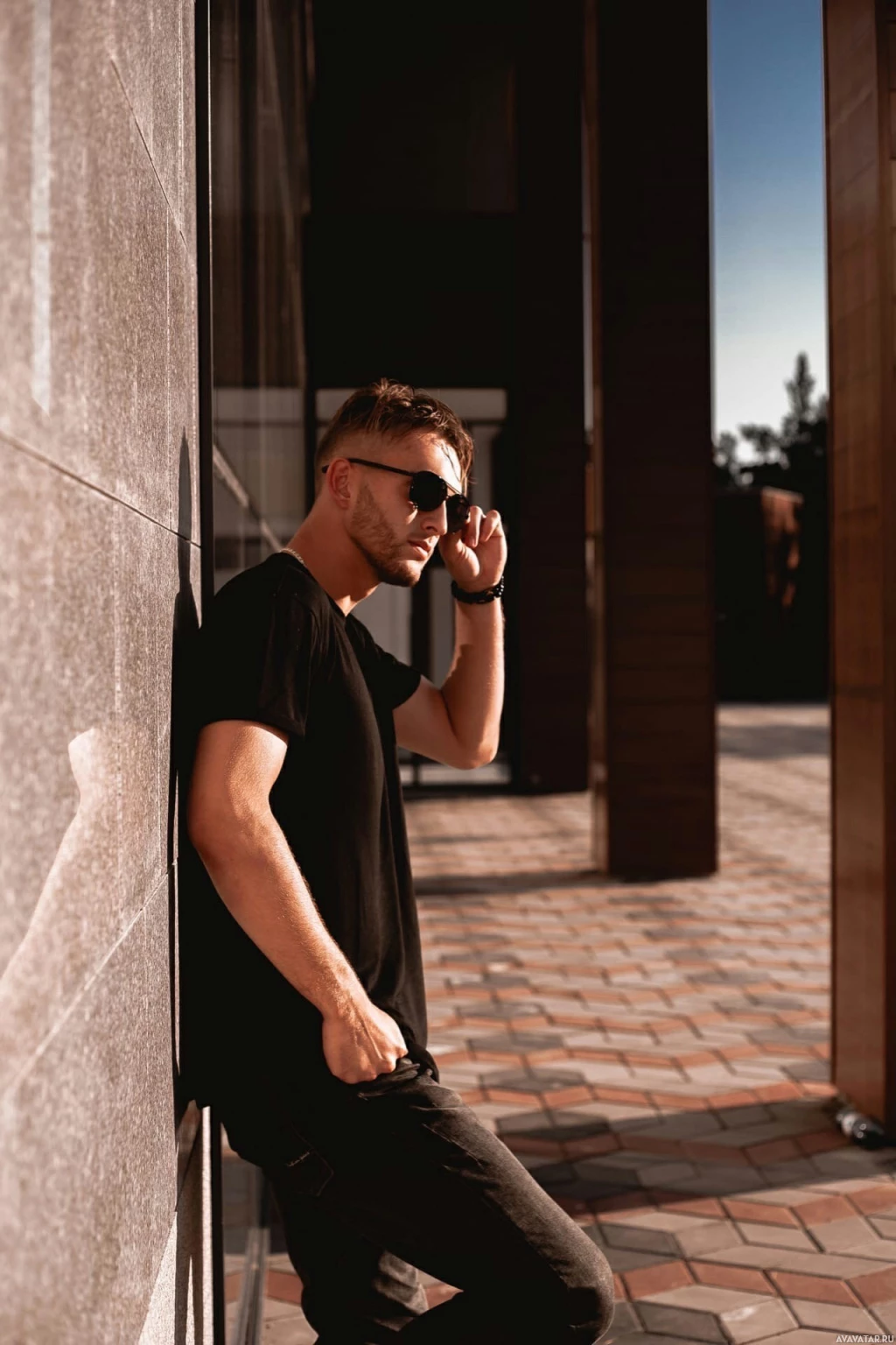 In the picture, there is a man leaning against a wall with his hand in his pocket. He appears to be wearing sunglasses and is looking away from the camera. The setting seems to be an outdoor area during sunset or twilight, as suggested by the warm lighting.