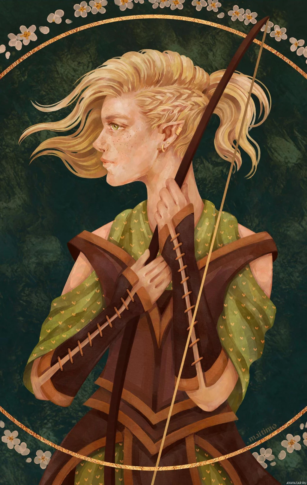 The image depicts a character that appears to be an elf, dressed in fantasy-style attire. The character is holding what looks like a bow and arrow, suggesting they might be a ranger or an archer within their narrative context. The setting has