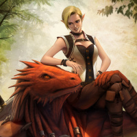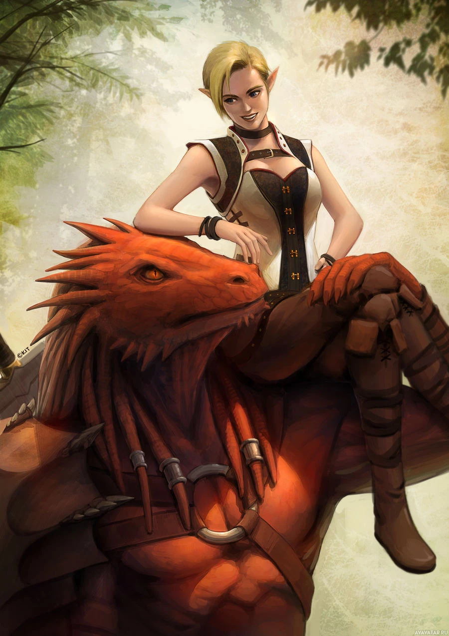 an elf character seated on the back of a red dragon, which is often referred to as a "dragon" in this context. The setting appears to be