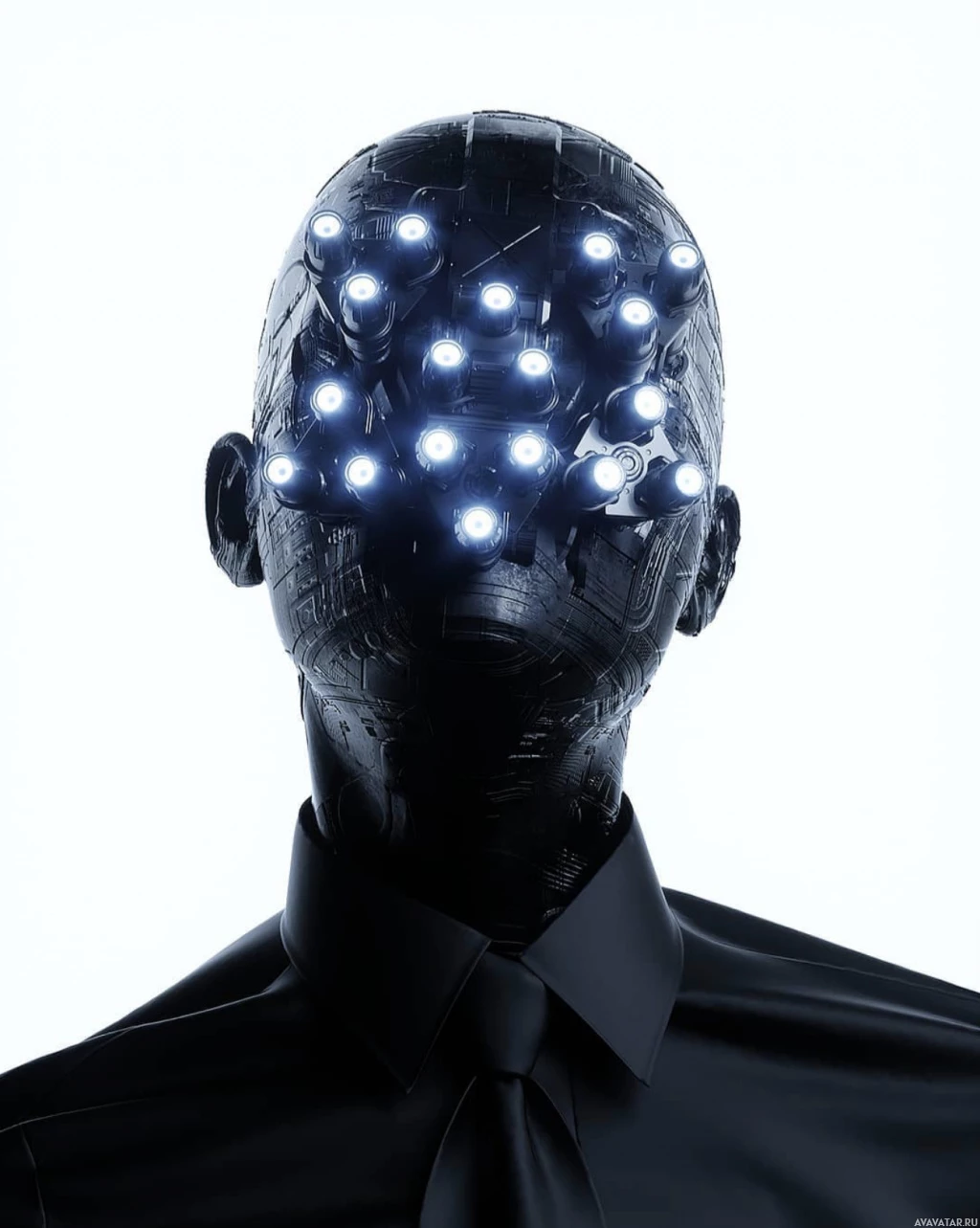 На картинке изображена человекоподобная фигура с головой, в которую, по-видимому, встроены различные электронные компоненты и источники света, что наводит на мысль о передовых технологиях или кибернетических усовершенствованиях. Такого рода изображения часто ассоциируются с научно-фантастическими темами, связанными с роботами или искусственным интеллектом.