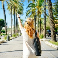 blonde hair and is wearing a light-colored dress, along with a black handbag. The background includes palm trees and buildings that suggest