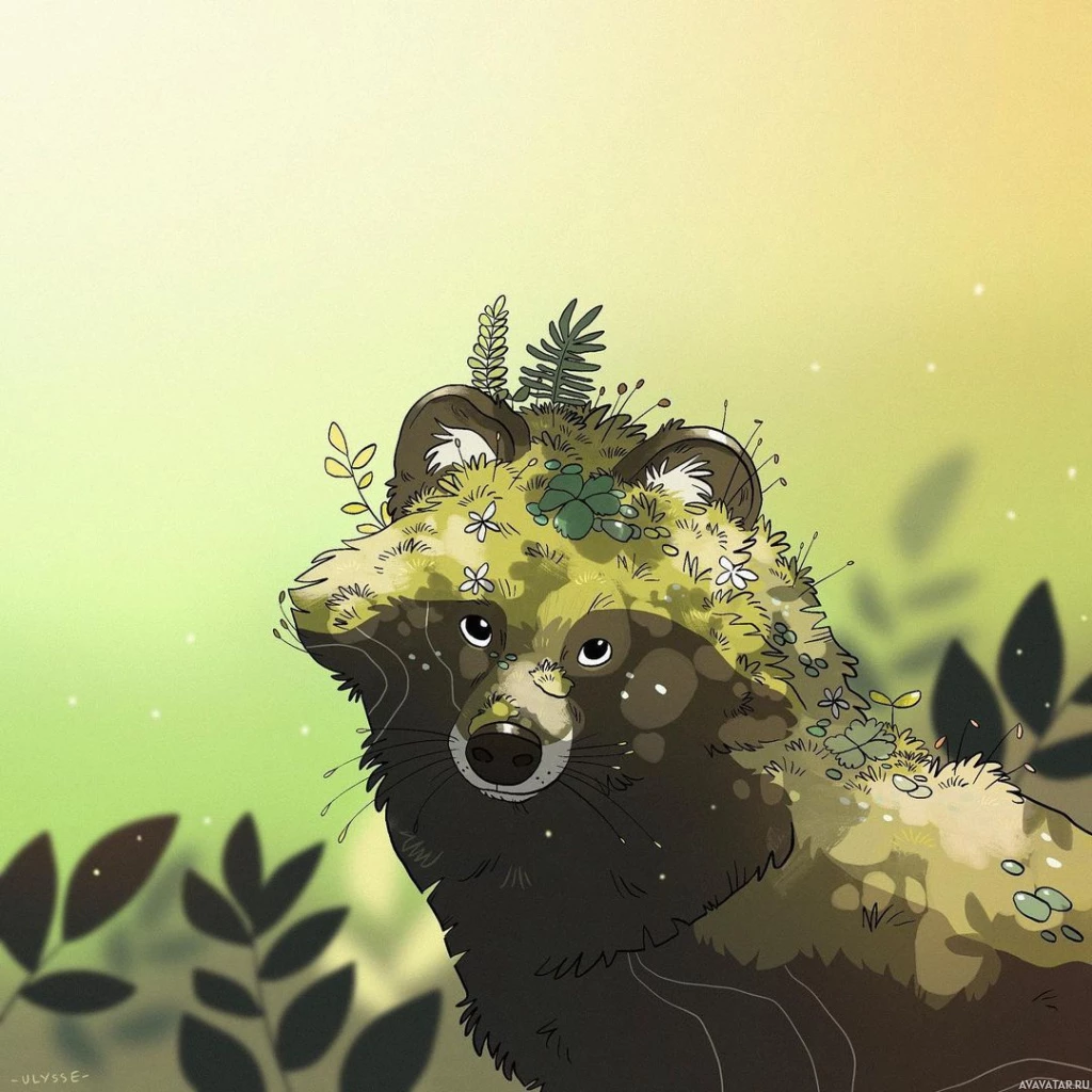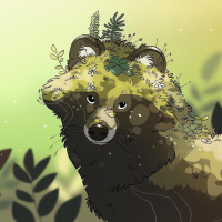 The image depicts an illustrated raccoon with a lush green and yellow background, possibly representing the woods or meadow. The raccoon is adorned with moss and