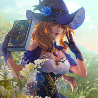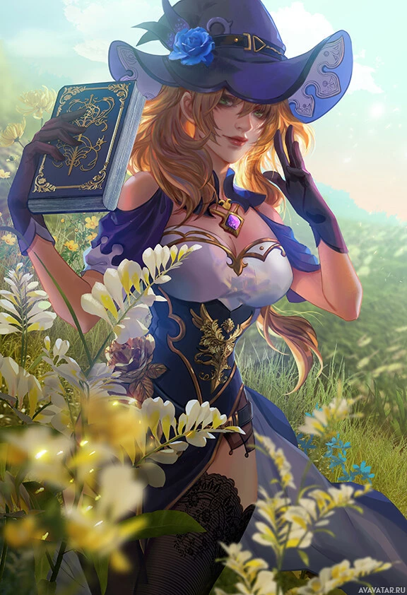 an animated character dressed in a witch's outfit, with a wand and a book in her hands. She is wearing a purple dress, a black hat with a blue flower on it, and has long