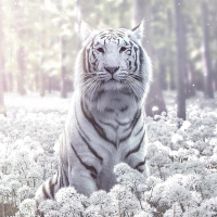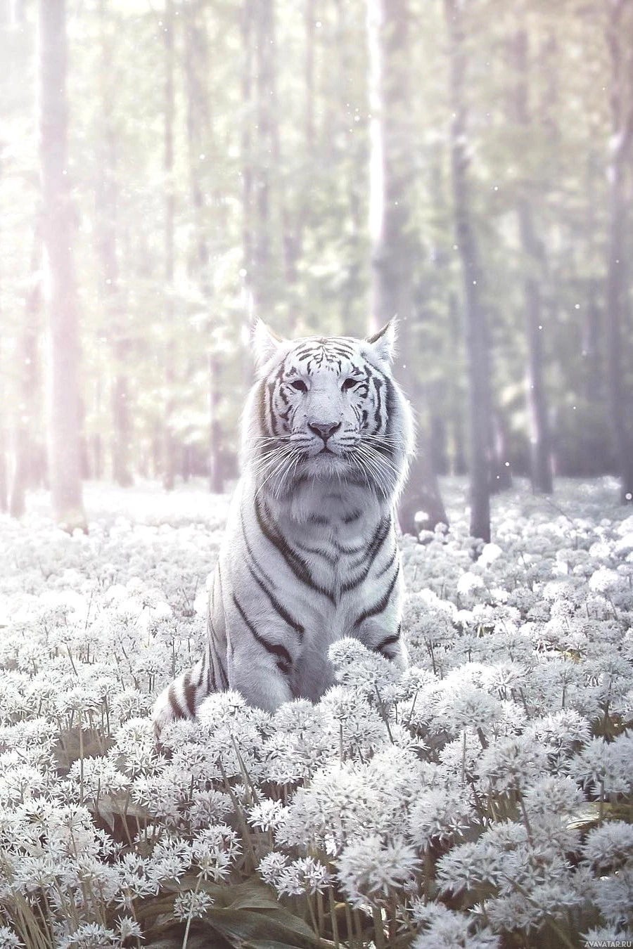 The image features a tiger sitting among what appears to be a field of flowers with a serene, misty background that suggests