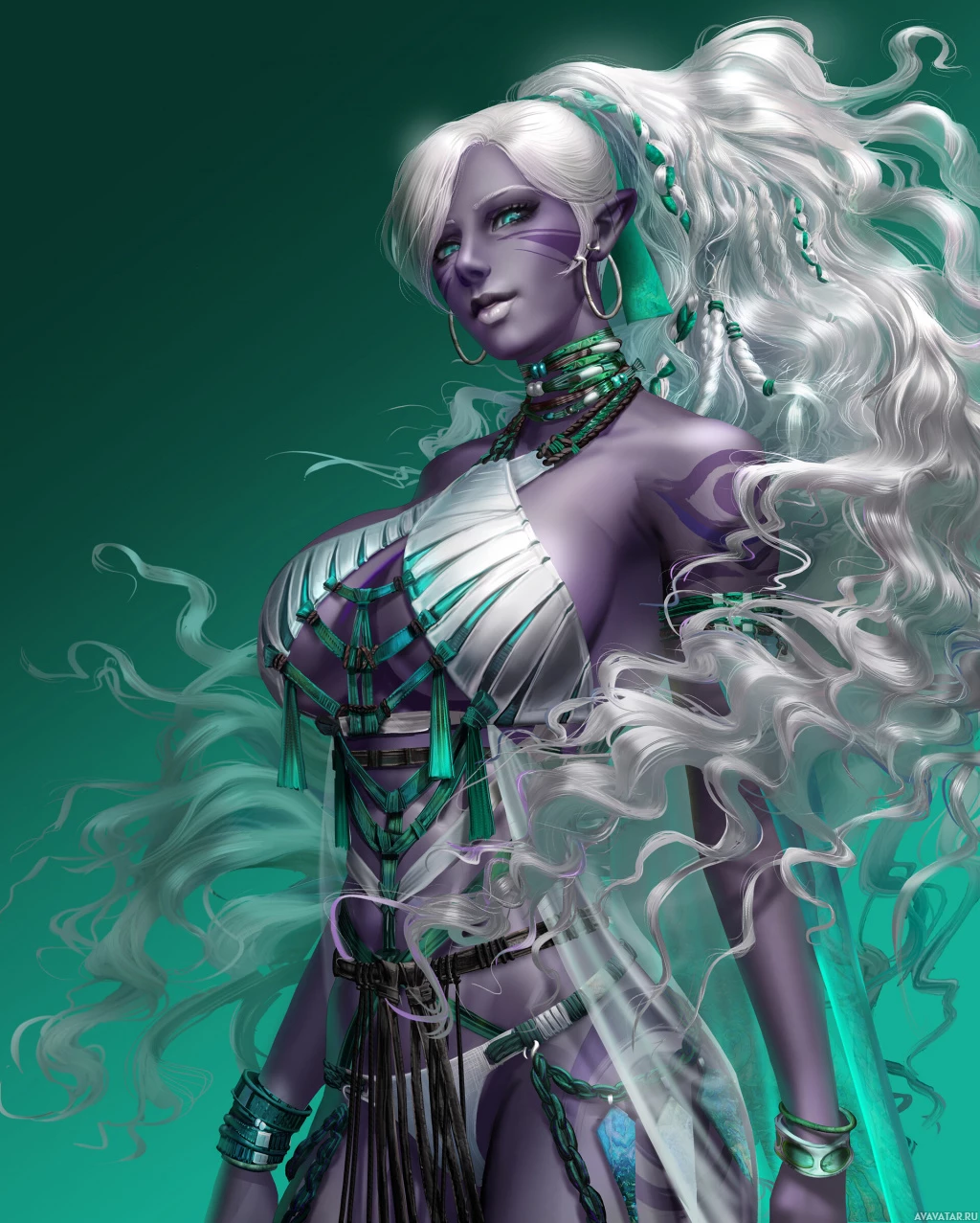 a female character, likely from a fantasy or "drow" genre setting. She has