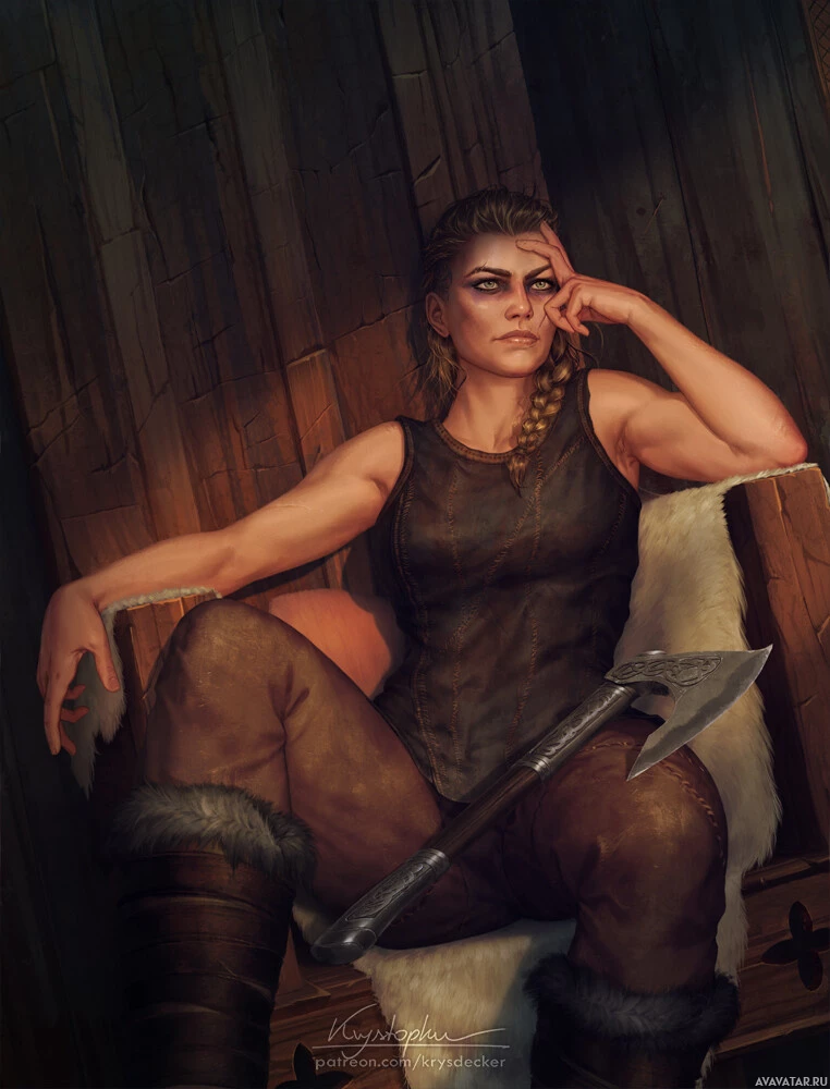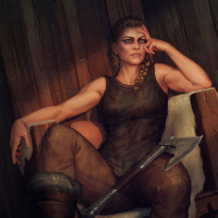 The image depicts a woman sitting on what appears to be a stool or chair. She is wearing armor and holding an axe in her hand, suggesting that she might be a character from