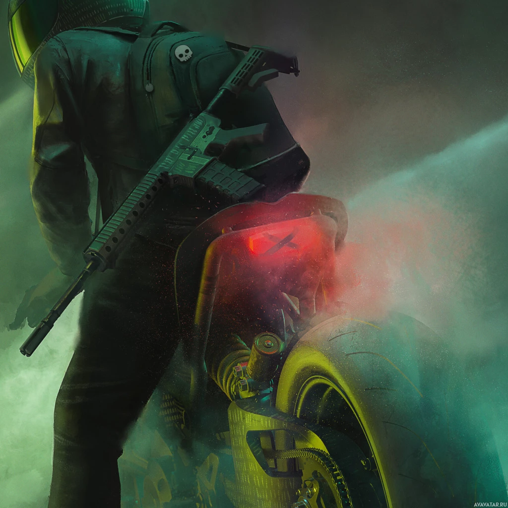 На картинке изображен человек на мотоцикле сзади. На мотоциклисте надет шлем, и кажется, что он находится в движении, о чем свидетельствует размытый фон. У него в руках оружие, которое, судя по внешнему виду, может быть штурмовой винтовкой или дробовиком. Обстановка кажется индустриальной или постапокалиптической из-за присутствия темного дыма или дымки, которые придают сцене драматический эффект.