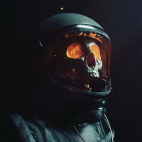 The image features a person wearing an astronaut suit with a skull for a face, suggesting a Halloween costume or a creative take on the traditional astronaut look. The background appears dark and could be interpreted as space or a night setting.