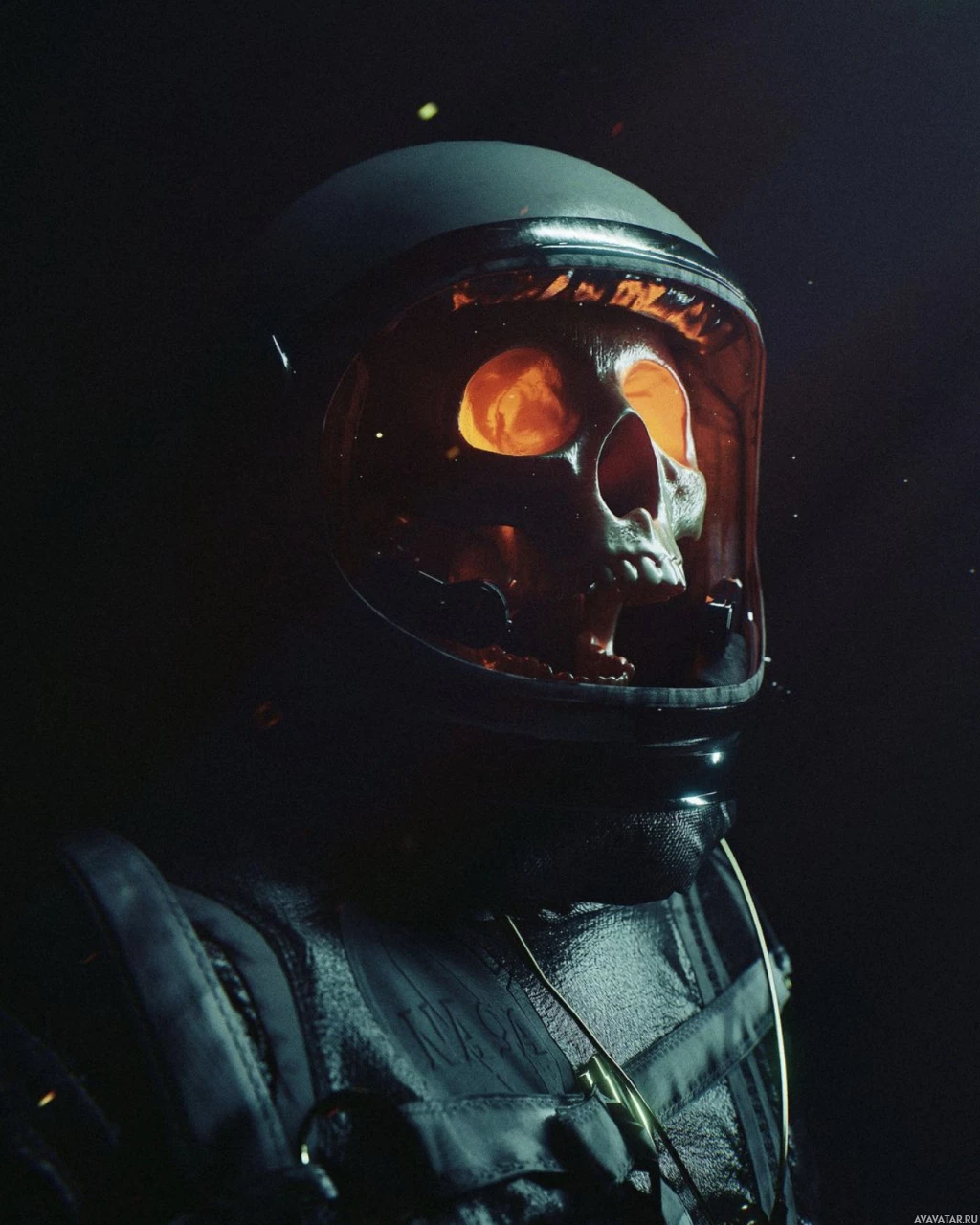 На картинке изображен человек в костюме астронавта с черепом вместо лица, что наводит на мысль о костюме на Хэллоуин или о творческом подходе к традиционному образу астронавта. Фон выглядит темным и может быть интерпретирован как космос или ночная обстановка.
