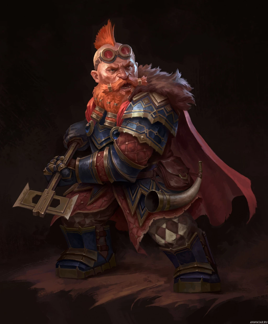 a distinctive helmet with goggles around the neck, adding to his rugged appearance. In his right hand, he holds what appears to be a warhammer, which is typical equipment for dwarves in
