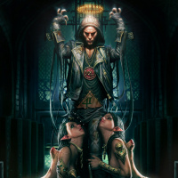 a hooded cloak, and he appears to be sitting on a throne or raised platform that resembles a temple-like structure. He has an expression of authority or command. Flanking him are two women who seem to be kneeling or sitting at his feet; one is looking upwards towards the man with