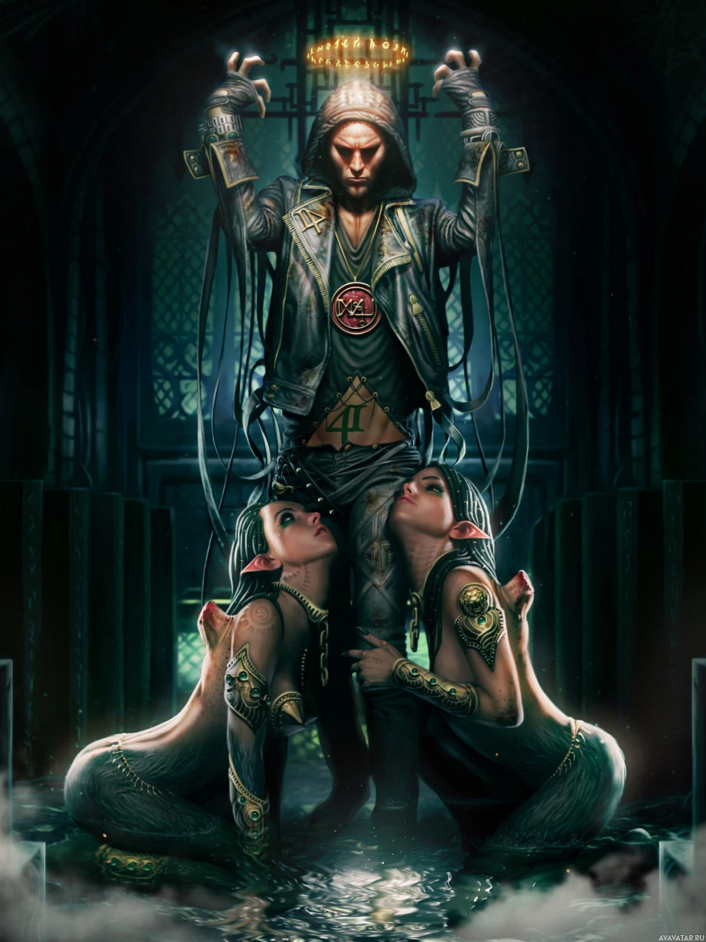 a fantastical scene with three individuals. In the center, there is a man dressed in dark clothing, possibly