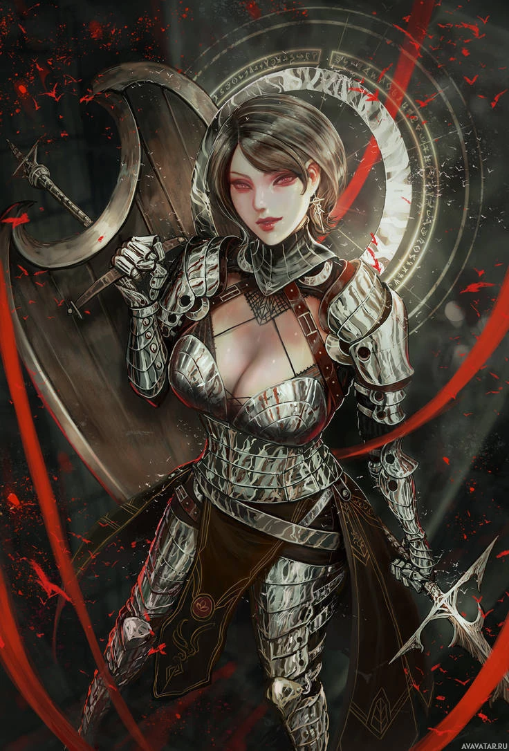 dark hair and is wearing armor, which includes a breastplate, gauntlets, and a helmet with what appears to be an eye patch on one side. She also holds what seems to be a magical or mystical object in her right hand. The background has a chaotic, swirling pattern that could suggest a battlefield or