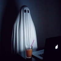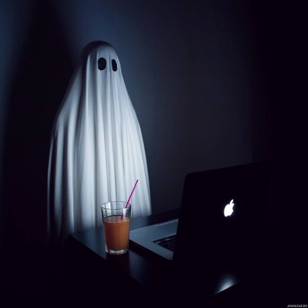 На картинке изображен призрак, сидящий за компьютером с напитком на столе. Перед призраком стоит ноутбук и чашка, в которой, похоже, есть фиолетовая соломинка.