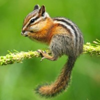 The image shows a small chipmunk perched on a plant stem or grass. The chipmunk has distinctive stripes and is in focus, while the background is softly blurred, emphasizing the animal. It appears to be in a natural setting, likely in a forest or park.