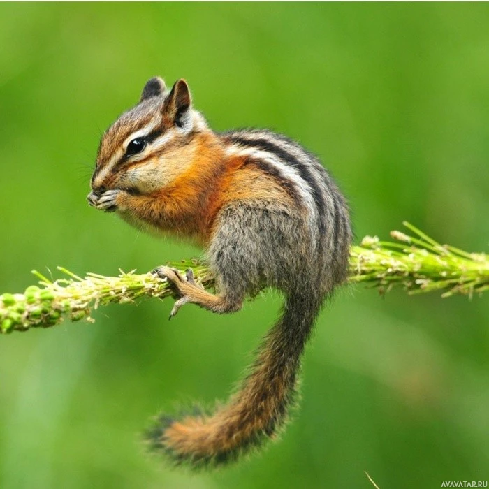 На снимке изображен маленький бурундук, сидящий на стебле растения или траве. Чипмюнк имеет отличительные полосы и находится в фокусе, в то время как фон мягко размыт, подчеркивая животное. Он находится в естественной обстановке, вероятно, в лесу или парке.