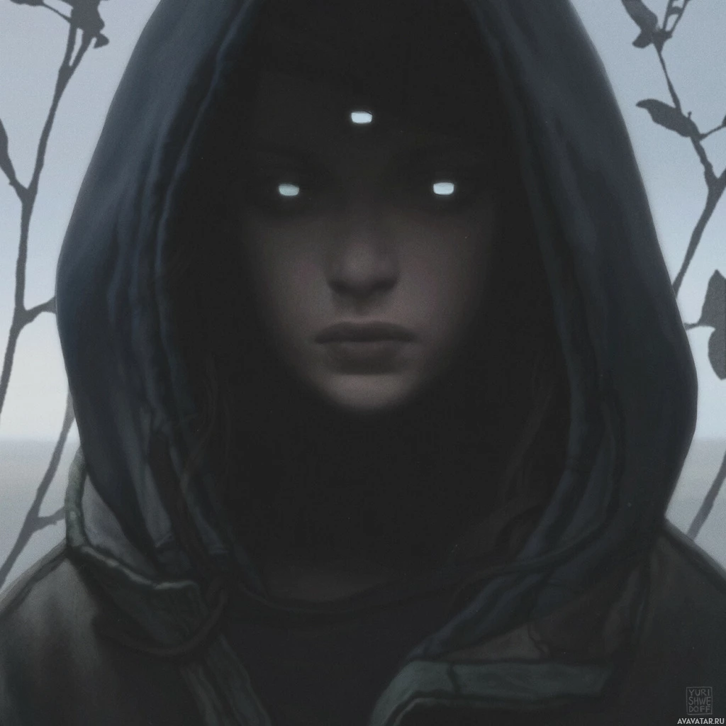 a hooded garment or jacket that covers her head and upper body. Her eyes are depicted as empty,