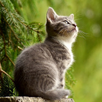 На картинке изображен маленький котенок, сидящий на чем-то, похожем на выступ или стену, и смотрящий на что-то снизу вверх. Снимок сделан на открытом воздухе в дневное время, а деревья и зелень на заднем плане наводят на мысль, что сейчас весна или лето.