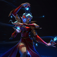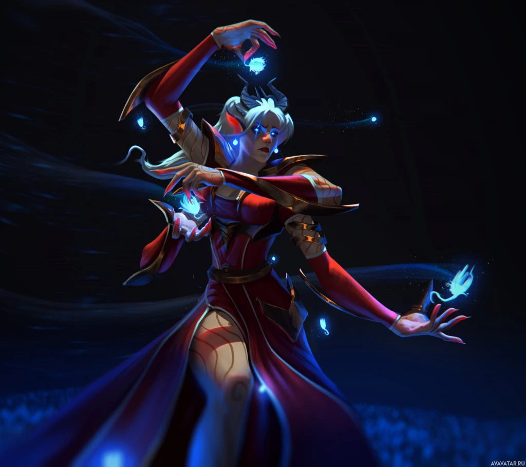 a fantasy character with white hair. She appears to be a mage or sorceress, as suggested by her holding two glowing