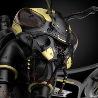The image shows a robot that has been designed to resemble an ant. It has a color scheme with yellow and black elements, similar to
