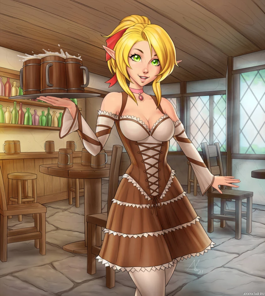 a cheerful expression on her face and is holding a tray of drinks in both hands, presenting them to the viewer or perhaps someone not visible in the image. The setting appears to be a cozy, rustic pub or tavern with