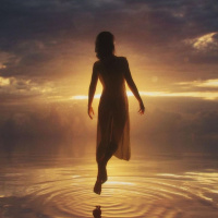 The image features a silhouette of a girl standing in water at sunrise or sunset, looking out towards the horizon. The lighting is warm with hues of orange and yellow, suggesting either dawn or dusk. The focus is on the back of the girl's figure, emphasizing her posture and the way she interacts with the environment around her. The reflection in the water adds a serene quality to the scene.
