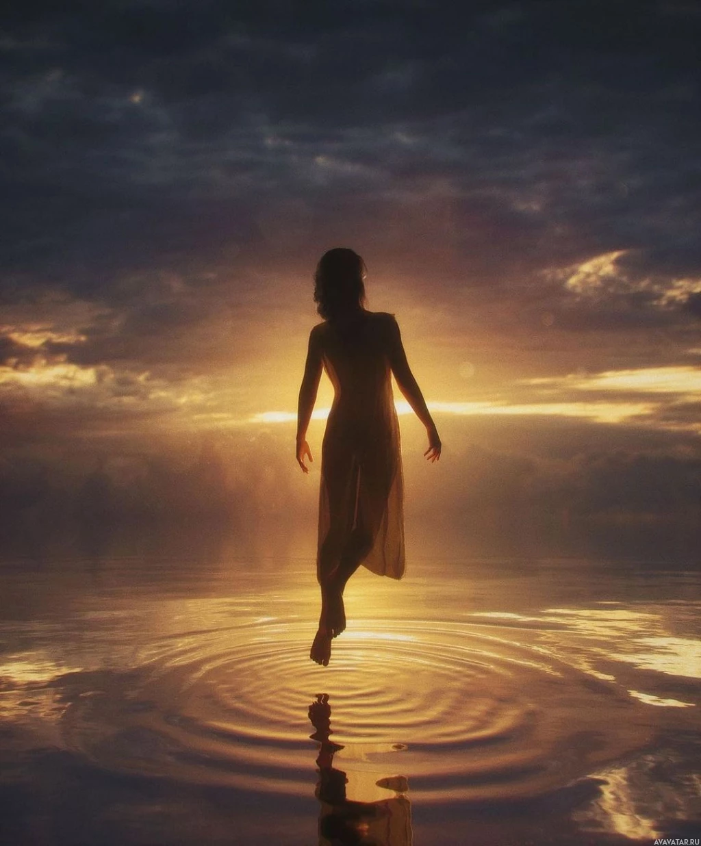 На картинке изображен силуэт девушки, стоящей в воде на восходе или закате солнца и смотрящей на горизонт. Освещение теплое, с оранжевыми и желтыми оттенками, что наводит на мысль о рассвете или сумерках. Основное внимание уделяется задней части фигуры девушки, подчеркивая ее осанку и то, как она взаимодействует с окружающей средой. Отражение в воде придает этой сцене безмятежный вид.