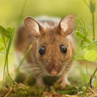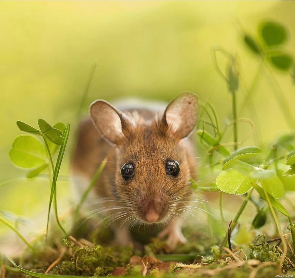 a small mouse, which is a common name for a rodent of the family Muridae. It appears to be looking straight at the camera with a somewhat surprised or curious expression. There are green plants in the background, suggesting