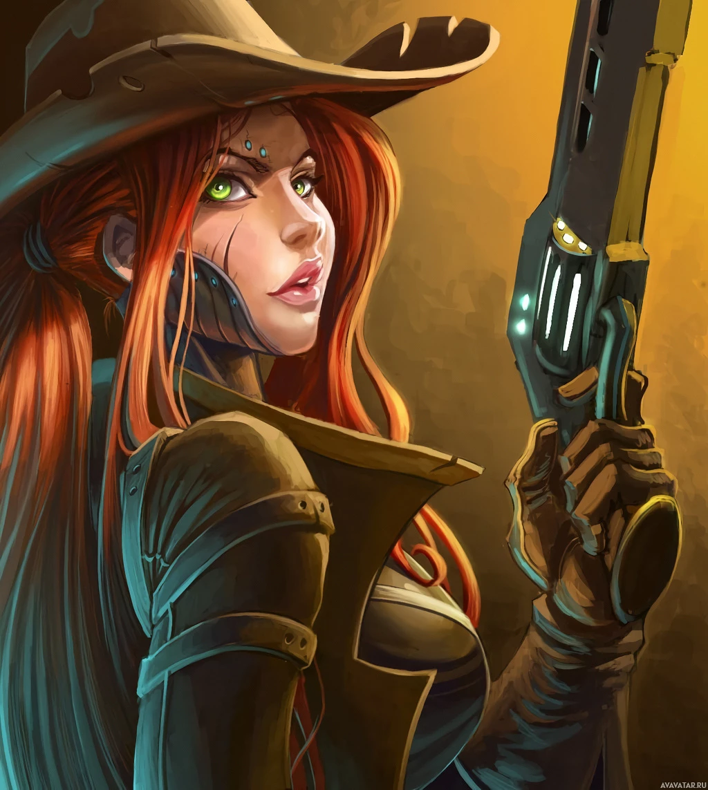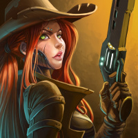 a female character with red hair, wearing a cowboy hat and a leather outfit. She has a pistol in her hand and is aiming it towards the viewer. The character appears to be from a stylized illustration rather than a photograph, which suggests that this could be from a comic book, graphic novel, or