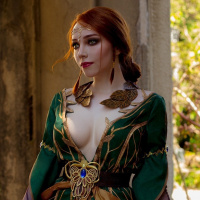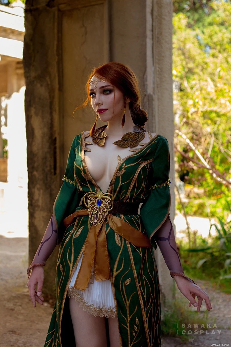 Triss Merigold from "The Witcher" game. The costume includes a green and gold bodice with intricate detailing, a skirt with