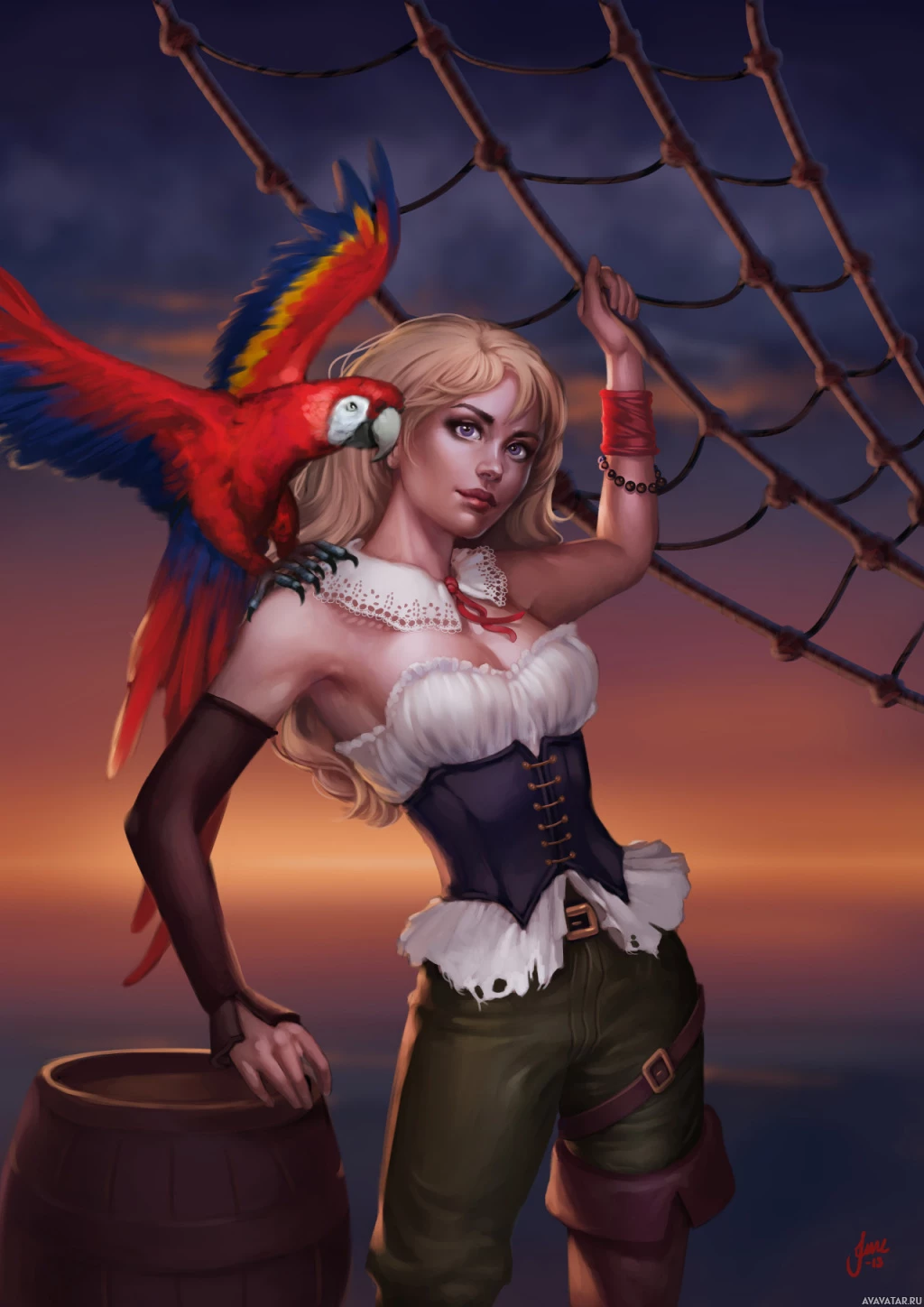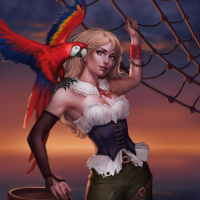 blonde hair and is wearing a pirate-themed outfit with ruffles and puffy sleeves, which suggests a fantasy or adventure setting. Her hand is placed on what looks like a rope, possibly part of a ship rigging or