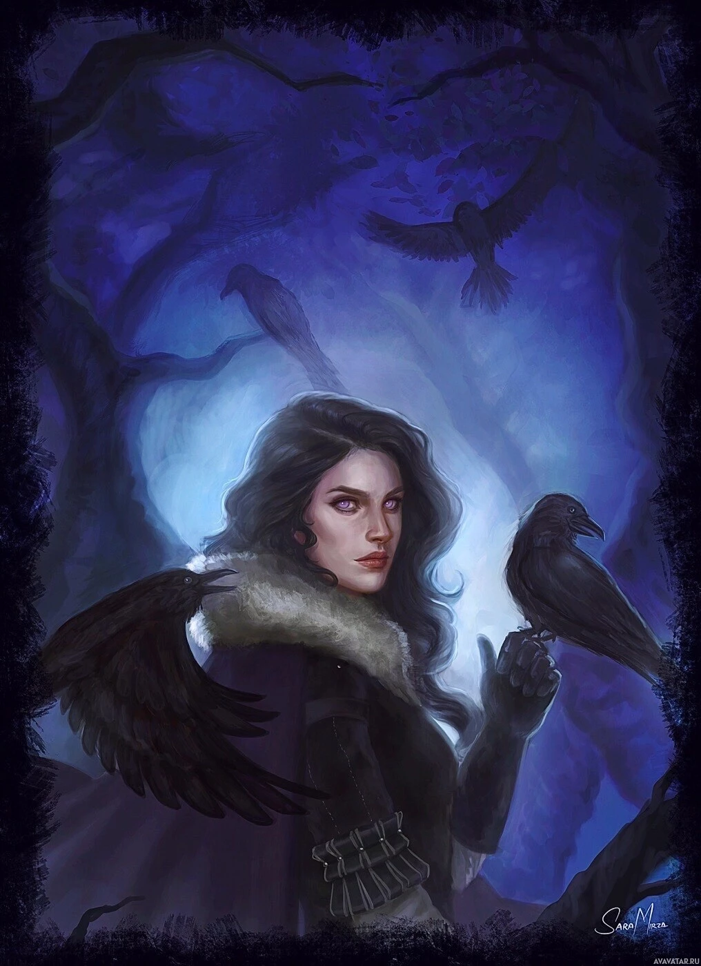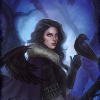 dark attire that includes feathers. Above her is a crow perched on a branch. The background shows a moonlit forest or twilight sky, which adds to