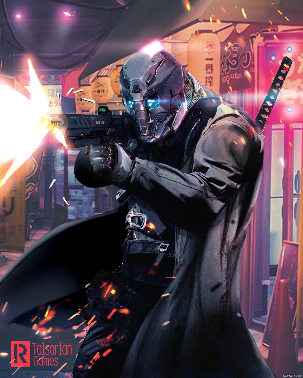 futuristic gear, including a weapon that appears to be a rifle. The setting looks like an alley or a street in a city with neon signs and debris scattered about, which is consistent with