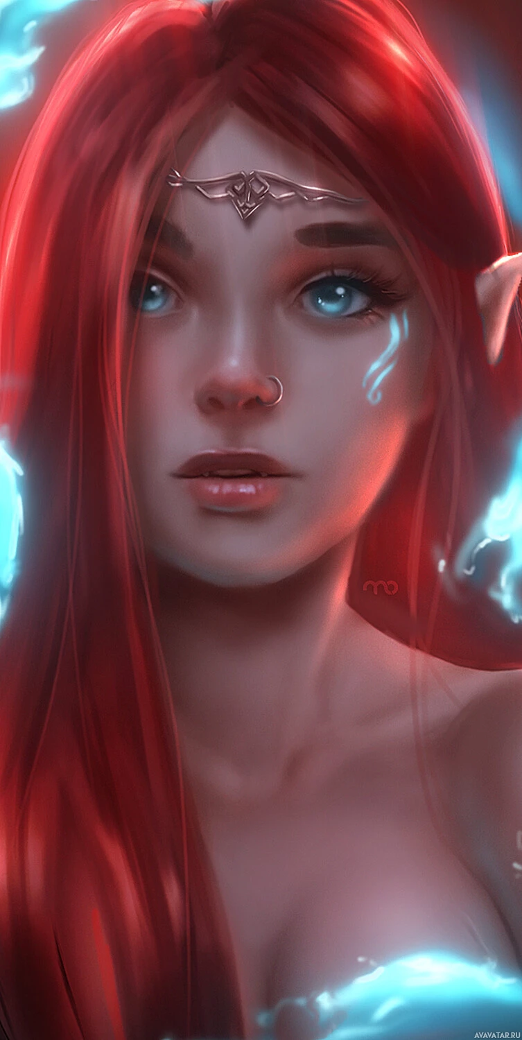 a fantasy character with red hair, resembling an elf. The character is shown in profile and has a thoughtful or contemplative expression. They have