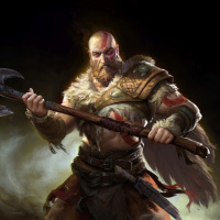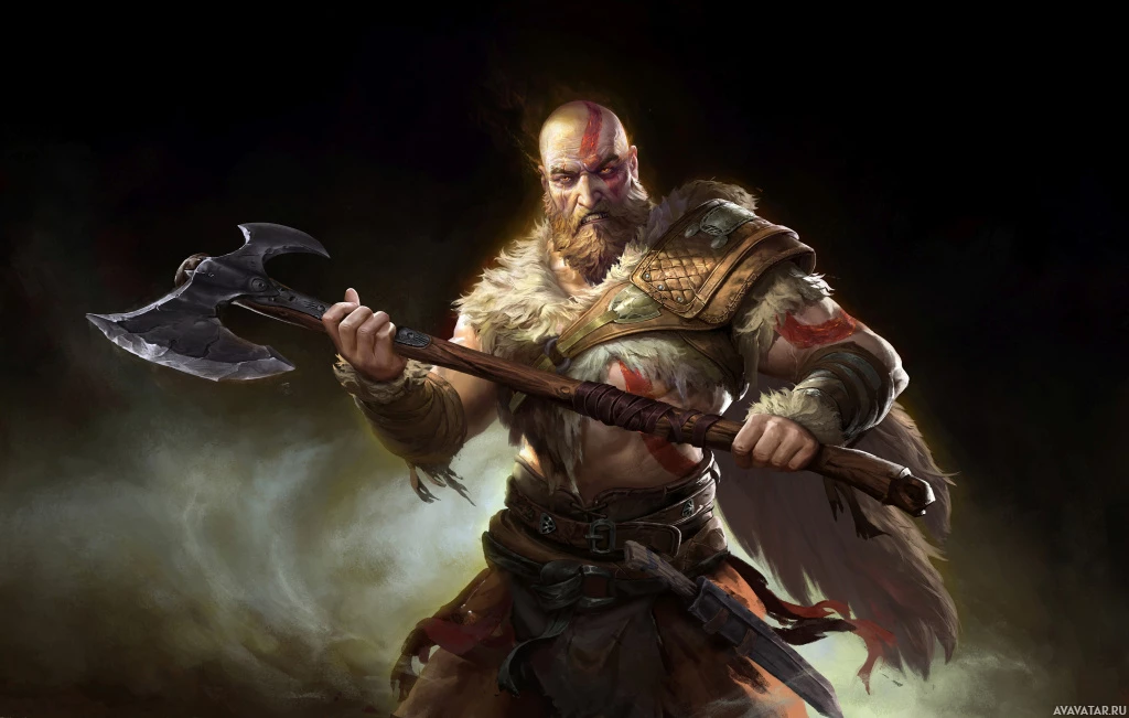 The image shows a character holding an axe, who is known as Kratos. He is depicted in a stylized artistic form, likely from