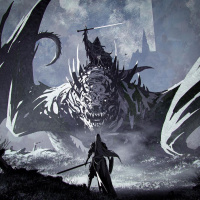 На картинке изображена фантастическая сцена, в которой воин стоит на переднем плане лицом к огромному дракону с широко распростертыми крыльями. Фон напоминает поле битвы или пустынный пейзаж. Освещение и художественный стиль передают ощущение эпических приключений и фантастических сражений, типичных для жанров высокого фэнтези.