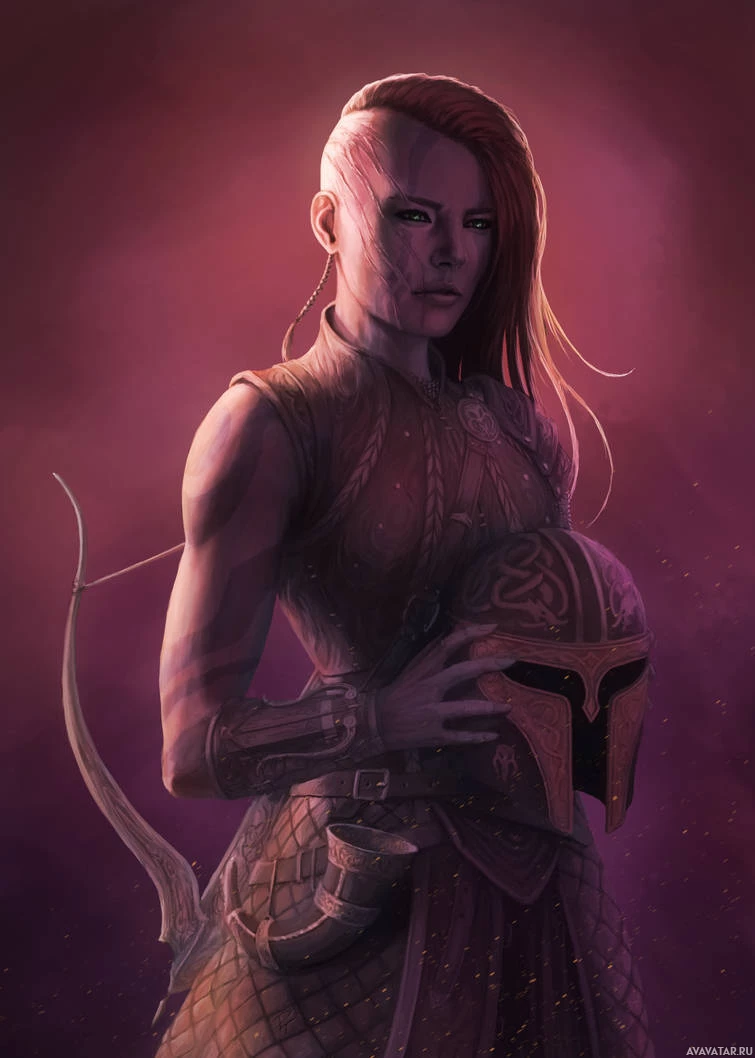 red hair and is wearing a helmet with a visor and a piece of armor that could suggest she is part of a warrior culture. She also has a bow in her right hand, which might indicate that she is