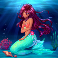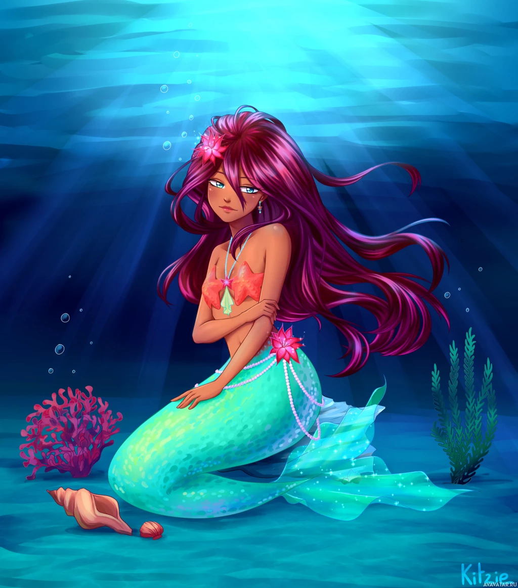 red hair and is wearing a mermaid tail with scales in shades of blue and green. Her skin appears to be human-like, and she has a somewhat