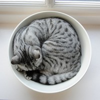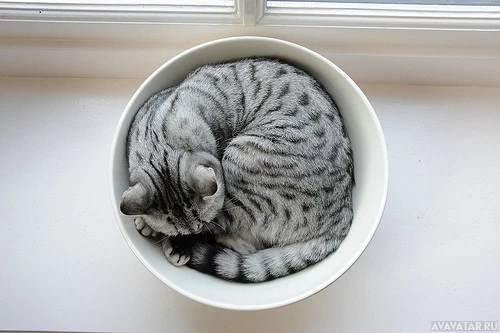 На снимке изображена серая и белая кошка, свернувшаяся в круглой миске или контейнере. Кошка, по-видимому, спит или отдыхает, и чаша помещается на поверхность с окном рядом, о чем свидетельствует естественный свет.