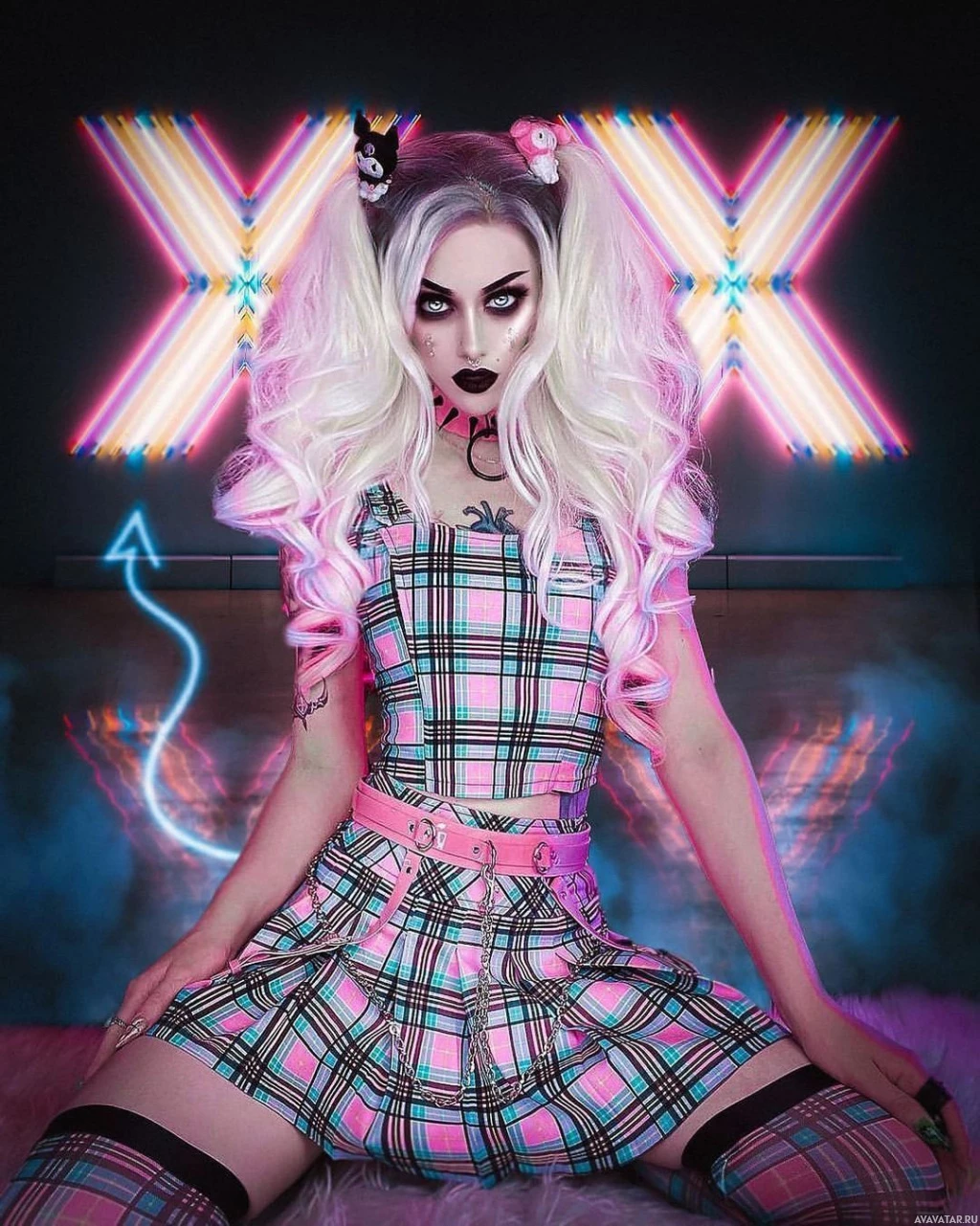 blonde hair and are wearing heavy eyeliner and dark lipstick that gives them an intense look. Their outfit includes a pink