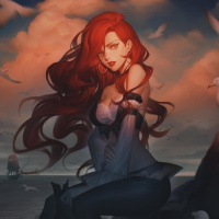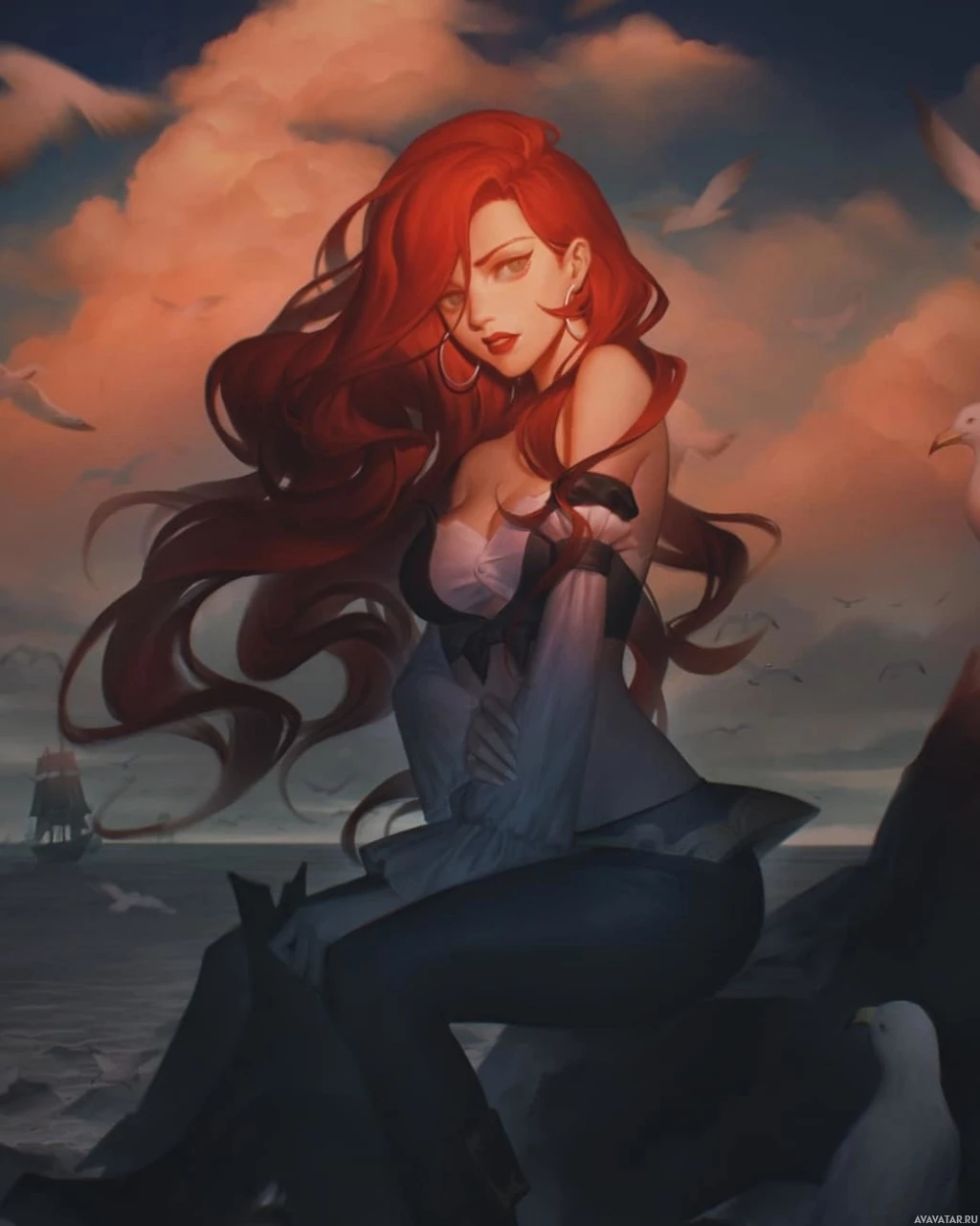 red hair. She has a stylish and somewhat dramatic outfit, featuring a top with