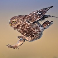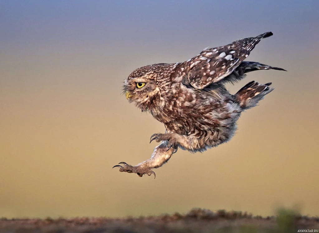 an owl in flight. It's captured mid-air, with its wings spread wide and its