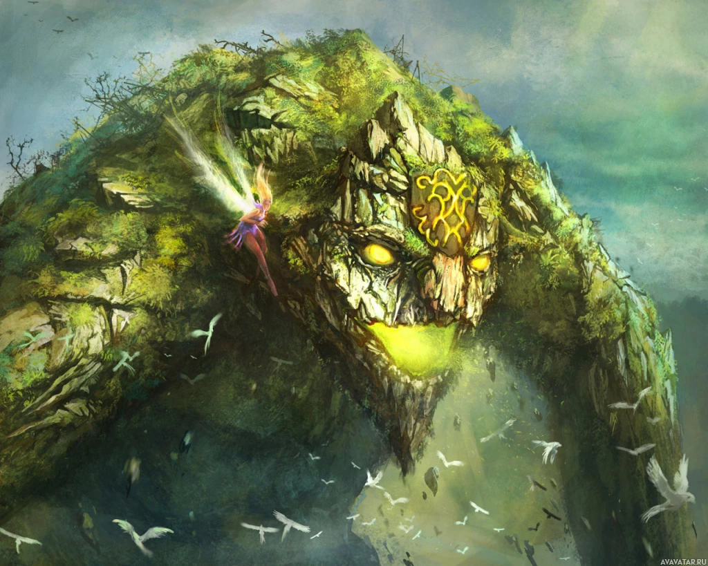 a fantasy scene with a large, menacing monster and a small, colorful creature interacting. The setting appears to be in a forest or jungle environment, with