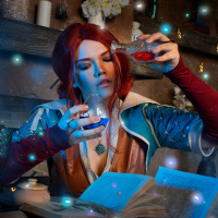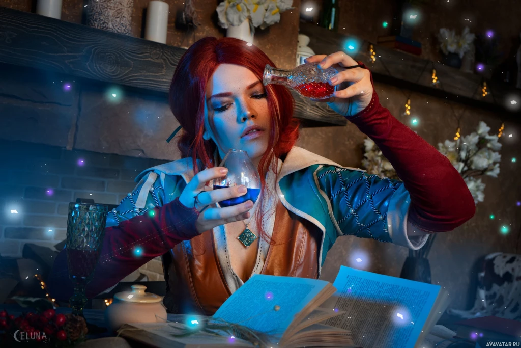 The image shows a person dressed in cosplay as the character Triss Merigold from